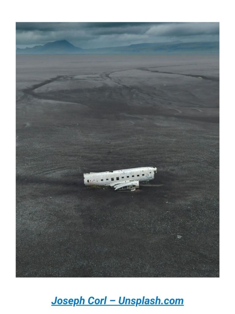 The image, as described by the photographer, “A moody DC3 plane wreck sits stranded on the vast black sand of Sólheimasandur Beach in Iceland.” The wreckage is white, the background features hazy, dark mountains, and the sky is filled with clouds.