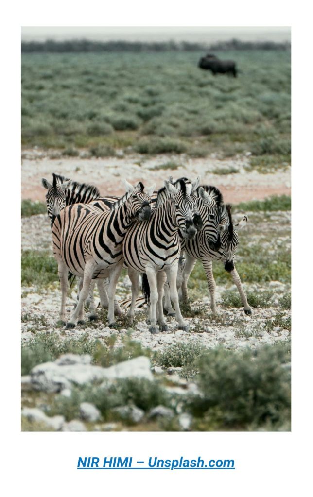 Here is this week’s image to get your creative juices flowing! It shows a herd of zebras standing together in a grassy, but also rocky, field. In the distance, you can see a fuzzy dark brown animal.