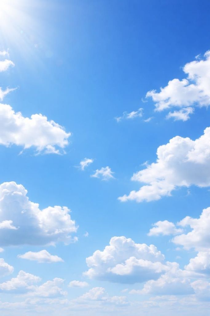 With fluffy white clouds floating by.