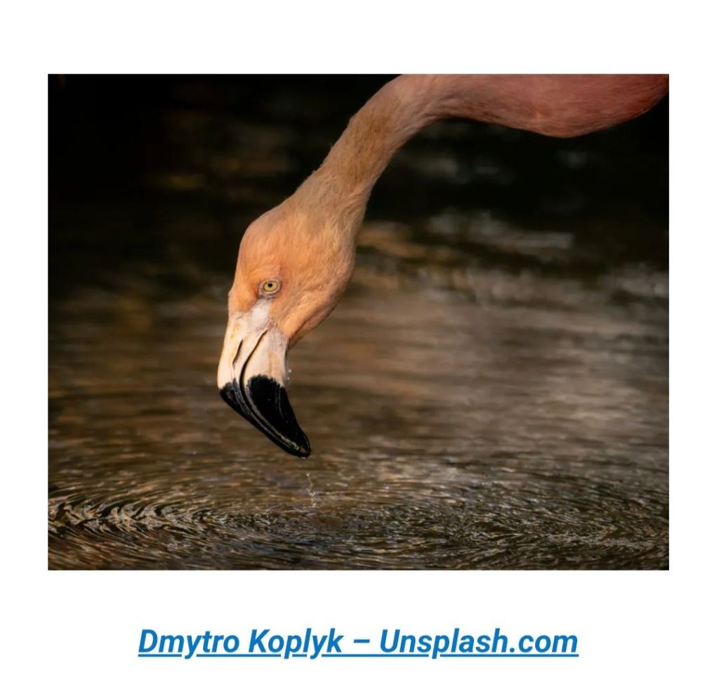 Here is this week’s image to get your creative juices flowing! This picture features a flamingo dipping its beak into water. It has a black-and-white beak, toned-down pink feathers, and yellow eyes. The background is dark and blurry, the pool of water a bit lighter, showing the ripples outward where it dipped down for a drink.