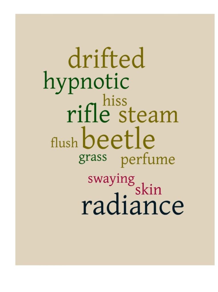 beetle, grass, perfume,swaying, skin, radiance.